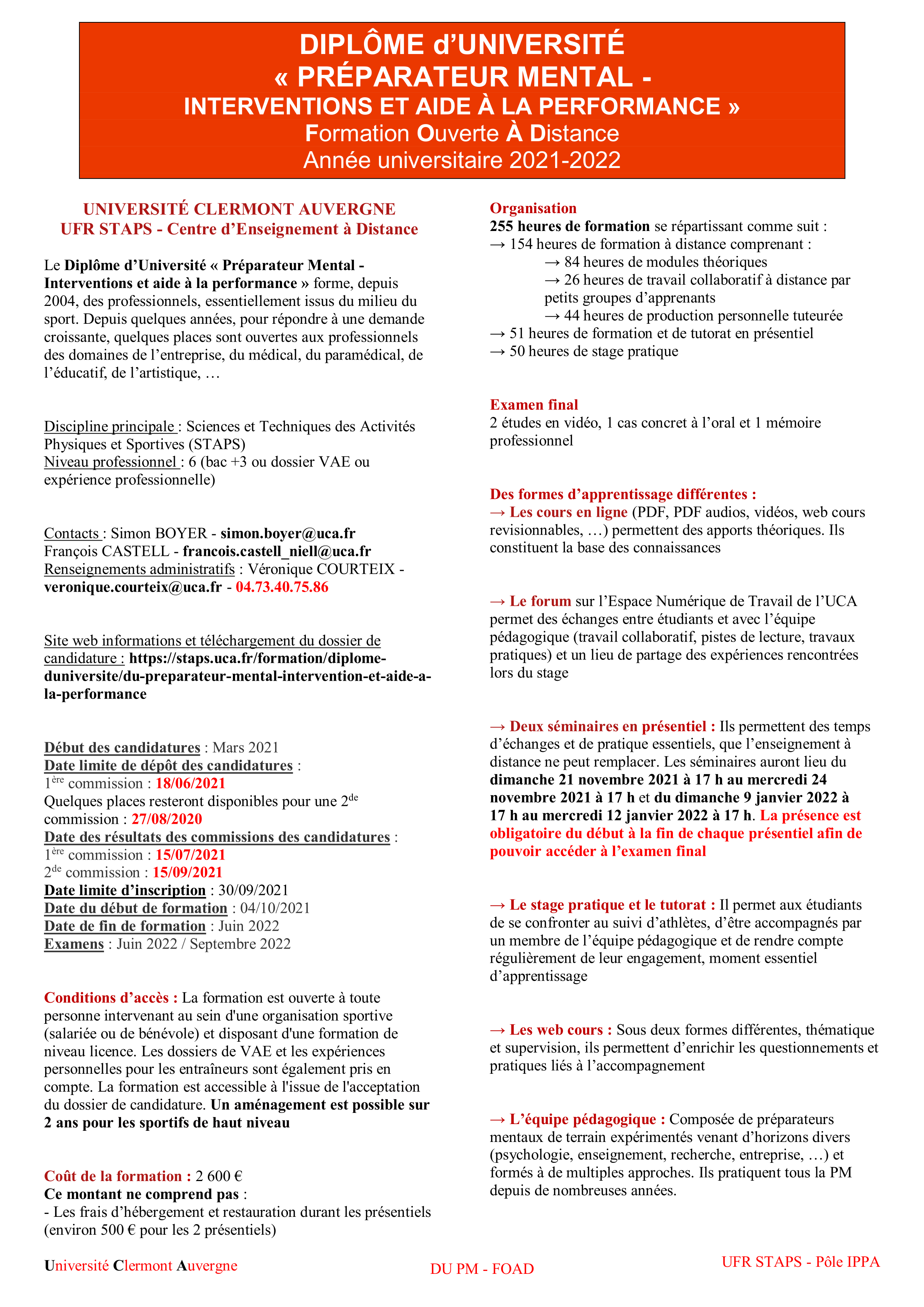 Diplôme d'Université de Préparation Mentale - Interventions et Aide à la Performance